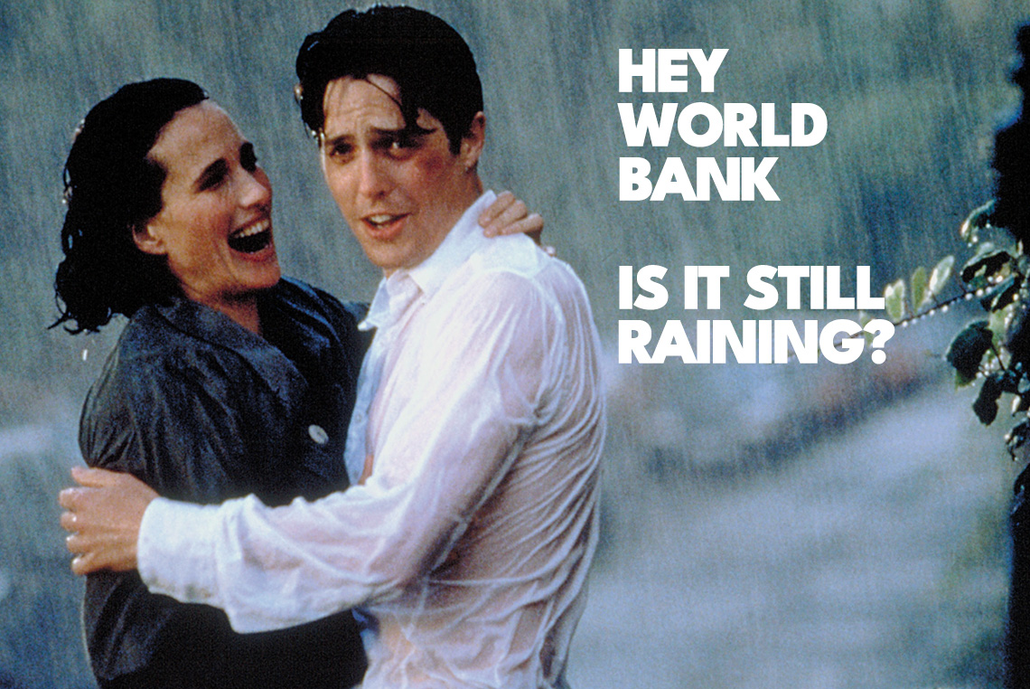 The crown of our campaign was creating a parody video based on that iconic moment in FOUR WEDDINGS AND A FUNERAL where a soaking wet Andie MacDowell asks Hugh Grant if it’s still raining. This featured iconic moments across film and TV, all centred around how impossibly obvious it is that it’s raining… so come on World Bank… open a window!!